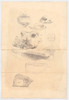 11. Eucarya Murrayana [at left in pencil with a smaller pencil sketch of an unidentified dwelling at far left and pencil sketch of unidentified flora at right. Rudimentary pencil sketch of trees and path on reverse]