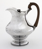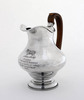 Coffee jug (a) has an inverted pear shaped body on stepped, plain, circular base. Hinged flat lid with floral finial, raised broad spout with reeding around the rim. Wooden handle with acanthus leaf attachments. The jug is engraved with a sheep above the inscription.